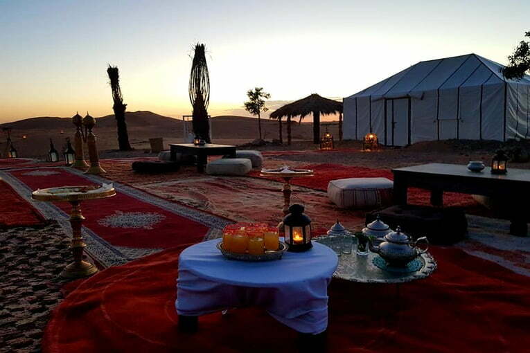 After breakfast you depart Dades Gorge to visit another deep oasis in Morocco the Todra Gorge. Its walls are 300m tall and at their most narrow part, they are about 20 meters apart. Spend some time exploring here before resuming your trip towards the Sahara Desert. Approaching Merzouga you will see the first sand dunes of the desert, where your camels will be waiting for you to carry you across Erg Chebbi. Travel on the back of your camels, or walk during a beautiful sunset. Spend the night in the Nomad tent in the camp in the desert.